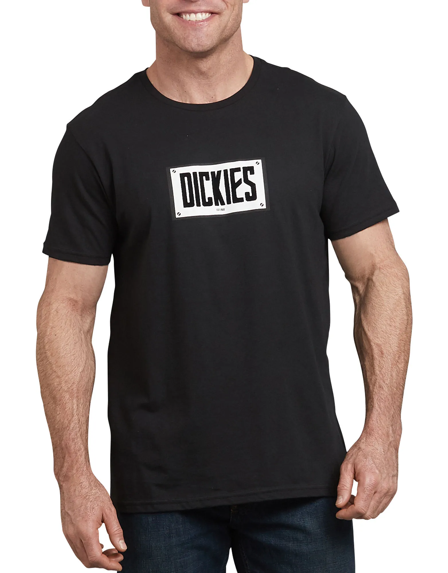 Keep it cool and casual with a graphic tee that speaks volumes. The soft cotton design that can be worn alone of under a Dickies hoodie or work shirt, keeps you comfortable and cool all day. The license plate graphic shows off your pride towards Dickies in a cool way.